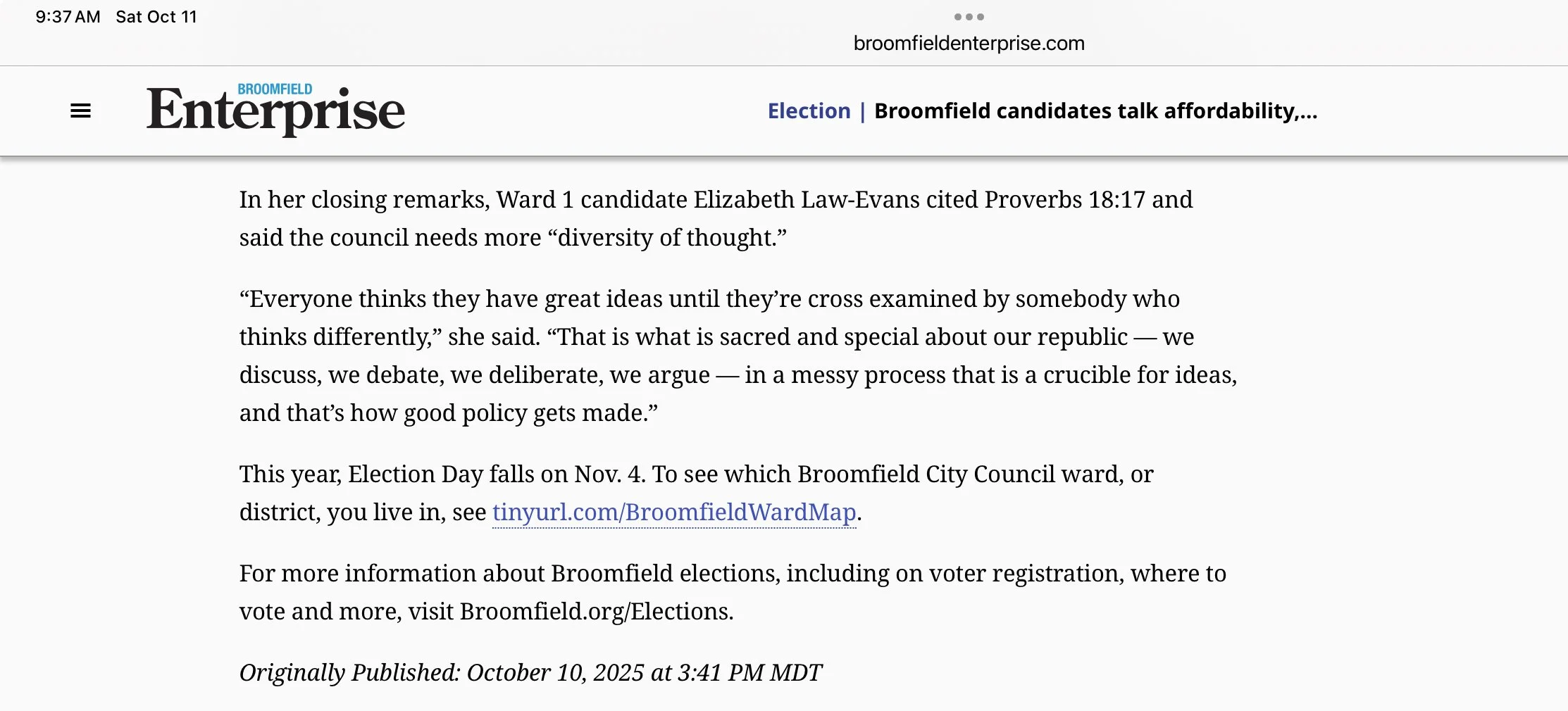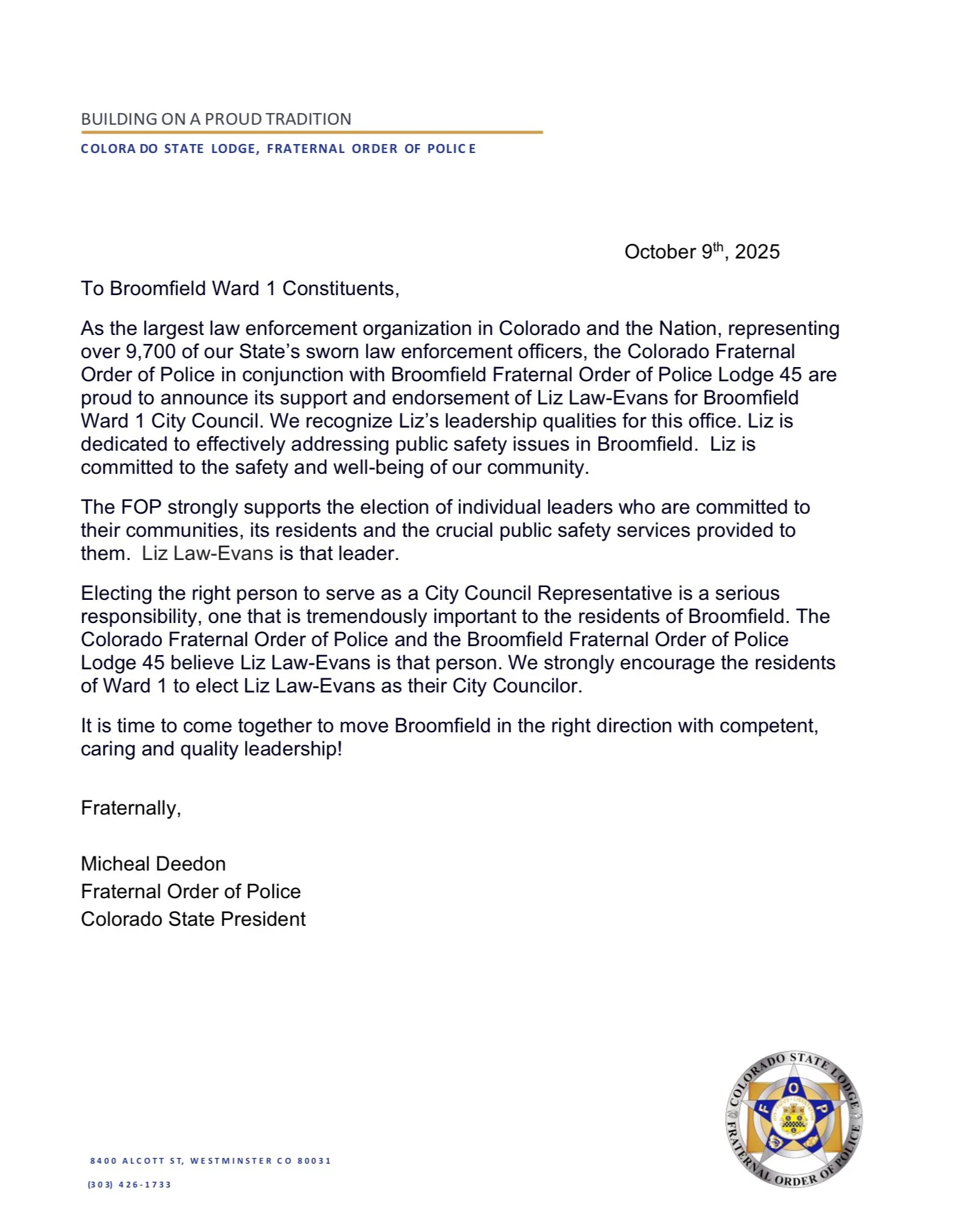 UPDATE October 10, 2025: I am honored and truly humbled to have received the endorsement of the Colorado Fraternal Order of Police in conjunction with Broomfield Fraternal Order of Police Lodge 45.